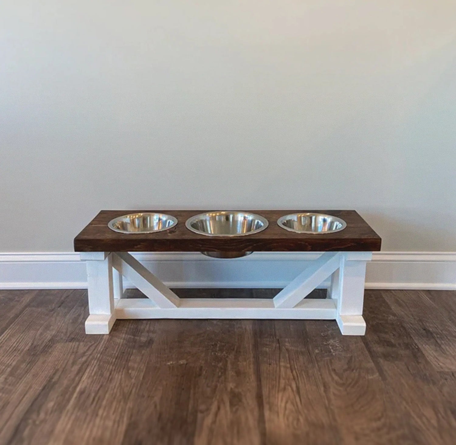 4.  Classic farmhouse stand designed with pine wood, a sturdy, yet GORGEOUS wood, that we stain with sealer its water resistant quality. Our elevated dog bowls can last a lifetime.